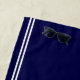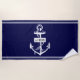 Nautical white anchor, name and lines navy blue Beach Towel. This nautical design displays a vintage anchor in white with frame and name and lines on the upper and lower parts.