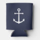 Modern Minimalist Nautical Can Cooler featuring white anchor on navy blue background.