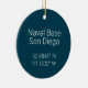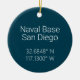Ceramic keepsake ornament features latitude and longitude map coordinates for Naval Base San Diego in California - also known as 32nd Street Naval Station, home of the Pacific Fleet