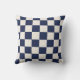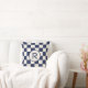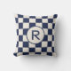 On the front of the navy and cream chequered pattern pillow, there is a beige circle with a custom monogram in the centre. Add your initial in the sidebar. Alternating navy blue and off-white squares form the bold geometric pattern behind it.