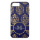 Chic elegant dark navy blue traditional vintage damask pattern and personalised monogrammed name and text templates. Personalise this formal sophisticated retro baroque swirly antique wallpaper patterned design with your custom monogram and name to the templates to create a unique stylish fashionable girly modern case, for her or him. Visit the CUSTOMIZEDSKINS STORE for matching products, PLEASE NOTE the golden colour is not metallic you can also customise the colour of the font from a range of over 200 custom colours.