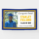 Hang this Navy and Gold Grad Photo Banner to celebrate your high school or college graduate. Personalise with your graduate's photograph, full name, class year, and school. It features a gold and navy border surrounding your grad's picture, their name in navy and 'Congrats Grad!', class year, and school in black.