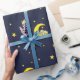 The navy and gold "Twinkle Twinkle Little Star" wrapping paper is a fun and whimsical way to wrap a child's birthday gift. Featuring a cute teddy bear "over the moon" surrounded by twinkling stars and a bright crescent moon, this design brings the magic of a celestial theme to life. The deep navy background paired with gold accents creates a playful galaxy setting, perfect for a "moon and stars" or "twinkle twinkle little star" party. This paper captures the excitement and joy of a first birthday, making them a delightful choice for moms planning a special celebration.