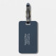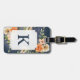 A pretty personalised luggage tag decorated with peach flowers over an elegant blue background.