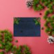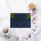 Company business gold foil christmas holiday party invitation with pine cone and branch elements on navy blue background, add your custom company corporate logo in fancy gold foil as well. Modern, elegant navy blue watercolor background with gold foil fancy script text to greet your employees, co-workers and friends with class and sophistication this holiday season. stylish flat greeting card.