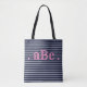 Perfectly preppy navy and bright pink seersucker striped customisable monogrammed tote bag