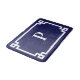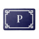 Decorative white Greek Key style geometric rectangular border on a dark navy blue 20” x 30” bath mat with a modern serif monogram.