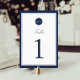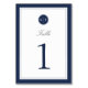 Simple and elegant monogram table cards feature a double border and circular monogram badge in classic navy blue and white.