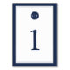 Simple and elegant monogram table cards feature a double border and circular monogram badge in classic navy blue and white.