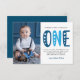 Modern, simple and elegant boy first birthday thank you card. Design featuring trendy script one , thank you message and a photo.
