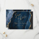 This elegant wedding save the date card features a background image of navy blue watercolor agate trimmed with faux gold glitter. The customisable text combines gold-coloured modern handwriting, copperplate and italic fonts. The reverse side features a coordinating navy blue and gold agate design.