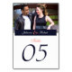 Simple and elegant modern photo wedding table number, belong to my Happy Together collection, features your custom photo with the names in a beautiful white script typo over a blue background with a big peach ampersand.