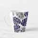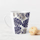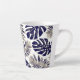 Modern navy blue and gold monstera and palm leaves tropical latte mug. The elements of this gorgeous design are a pattern made of dark blue monstera and palm leaves with gold outline and  your monogram in a frame.