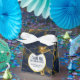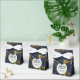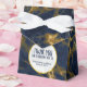 A personalised wedding favour box with a stylish and elegant background of navy blue and gold marble.