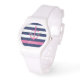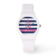 Navy blue and white stripes with a pink anchor and room for personalisation.