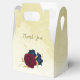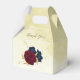 Beautiful wedding favour box featuring dark navy blue and red flowers and gold leaves.