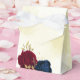 Beautiful wedding favour box featuring dark navy blue and red flowers and gold leaves.