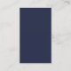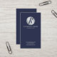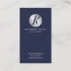 An elegant design featuring navy blue script monogram in silver circle element with business information in silver professional font style on navy blue background.