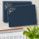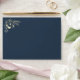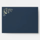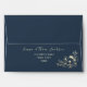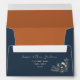 Simple, modern, calligraphy terracotta and navy blue wedding invitation 5x7 envelope with return address and gold floral lace.