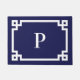 Decorative white Greek Key style geometric rectangular border on a dark navy blue 18" x 24" door mat with a modern serif monogram.