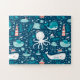 Add a custom nautical touch to your little kid's game collection with this adorable ocean jigsaw puzzle. Puzzle has a pattern of a whale, octopus, sailboat, steam boat, jellyfish, and lighthouse on a navy blue background. Puzzle may be personalised with the first name of your kid.