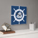 White nautical boat wheel with blue numbers with custom navy blue background.