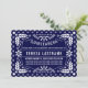 Navy blue and white papel picado Quinceañera fifteenth birthday invitation. This Mexican folk art style invitation features white flowers and leaves on dark blue background.
