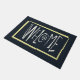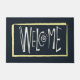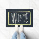 Welcome design with white letters and sun decoration in yellow frame on navy blue background. Welcome your guest with this shiny doormat.