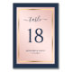 Elegant navy blue, blush and gold wedding table numbers with a modern script. Easily personalise these custom navy blue and blush table number cards with your wedding details.
