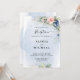 Design features an elegant watercolor floral wreath decorated with navy blue and blush pink roses, eucalyptus greenery. Design also features a a modern font - text layout. A matching floral arrangement is added to the back to carry over the overall theme.
