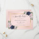 Elegant navy blue and blush wedding save the date cards featuring a gold frame decorated with blue and blush roses. Matching items available.