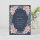 This design features a deep navy blue background that provides a dramatic contrast for soft peach roses and lavender lilac clusters. Verdant evergreen sprigs and pine needles add a seasonal touch to the lush botanical arrangement. The mood is sophisticated and formal, perfect for an evening event. A palette of midnight blue, coral, and muted purple creates a striking aesthetic.