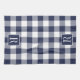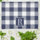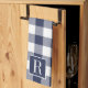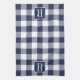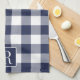 Custom-designed modern rustic kitchen towel featuring personalised monogram on navy blue buffalo check pattern.