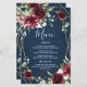 Design features a dark navy watercolor wash printed background with a printed gold coloured geometric or terrarium frame covered in elegant eucalyptus and greenery leaves/branches. Beautiful peony and rose floral elements in shades of burgundy, red, Marsala and more with hints of blush pink flowers appear over the greenery.