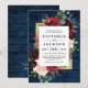 Design features a dark navy blue barn wood grain plank background decorated with an elegant floral wreath of peony rose flowers, eucalyptus greenery and more in shades of burgundy, Marsala red, maroon, blush pink etc. Design also features a printed gold colored border underneath the floral wreath for a modern look.
