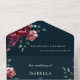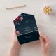 Customisable dark navy blue All In One wedding Invitation. Features burgundy, carmine, marsala red floral bouquets of flowers. With a RSVP tear off return card that also features a handy QR code that links guests directly to your wedding website. To generate a brand new "unique to you" QR code, enter your wedding website URL address in the area provided in the " personalise this template " feature. A brand new QR code will appear on the design that will link directly to your wedding website by scanning the QR code with the camera on a smartphone.