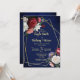 Burgundy roses greenery navy blue background gold geometrical frame floral wedding invitation template with QR RSVP code at the back.