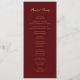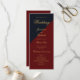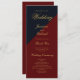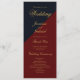 A modern navy blue and burgundy wedding program with gold text.