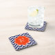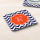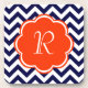 A customisable orange monogram frame is on a background of a bold navy blue and white chevron pattern.