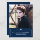 Announce your graduation to family and friends with this customisable photo graduation announcement card. It features simple typography on navy blue abckground. Personalise this navy blue graduation announcement by adding a photo, name, school and other details. This classic photo graduation announcement is available in other cardstock.