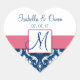 Navy Blue and White Floral Damask Wedding Save the Date Sticker with pink accent colour and monogram initial. Design by Elke Clarke©. Graphics licensed. Need a different colour or help please contact luxuryweddinginvitations@gmail.com
