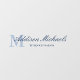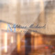 Neutral, elegant window cling with your initial in pale slate blue under your name and title in navy blue.