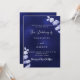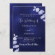 Navy blue background, decorated with eucalyptus stems, sprigs. The blue colour is uneven. Personalise and add your names and the details.