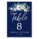 Bold navy blue and white peony floral evening wedding table number for a modern winter wedding. An elegant botanical spray of green leaves unfolds above trendy handwritten white script for gorgeous modern event decor.