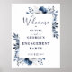 This elegant navy blue and white floral engagement party welcome sign can be personalised with your information in modern typography. Designed by Thisisnotme©