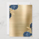 This elegant wedding invitation features blue floral bouquets set off with gold faux foil greenery in two corners, on a background image of gold brushed metal. The customizable text combines navy blue serif, italic and handwriting fonts. The reverse side features a matching navy blue and gold floral and gold brushed metal design.