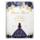 This elegant and glamourous Quinceañera guest book features a beautiful princess with dark hair in a tiara and navy blue ball gown. The text combines handwritten script and modern sans serif fonts for a classy and sophisticated look. The floral arrangements and gold confetti create the perfect blend of rustic and chic.