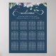 Featuring Navy Blue Floral Leaves Script Wedding Seating Chart! It is like a big sign that helps your family and friends to find their seats at your special party with a big welcome script typography. The navy blue background is like the night sky with pretty flowers and leaves on the top of chart. The table numbers and guest names are written in classic font. It is a cool way to show everyone where to sit and make your party look extra awesome!