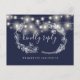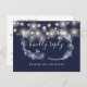 A navy blue RSVP card featuring pretty string lights, hand-drawn floral garland and chic typography. The reverse features your details and a fun guest song request. Designed by Thisisnotme©