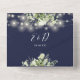All in one wedding invitation featuring pretty string lights, botanical floral greenery, and elegant typography on a navy blue background. The invitation includes a perforated RSVP card featuring a QR code. Designed by Thisisnotme©